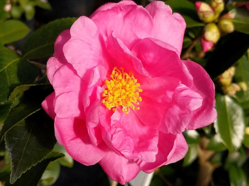 Outstanding! A true joy in the garden. Semi-double, fuchsia-pink 2.5 - 4” flowers elegantly displayed against glossy evergreen leaves from October to December. One of the most cold hardy Camellias. Dense, upright habit. An Ackerman hybrid from 1997.