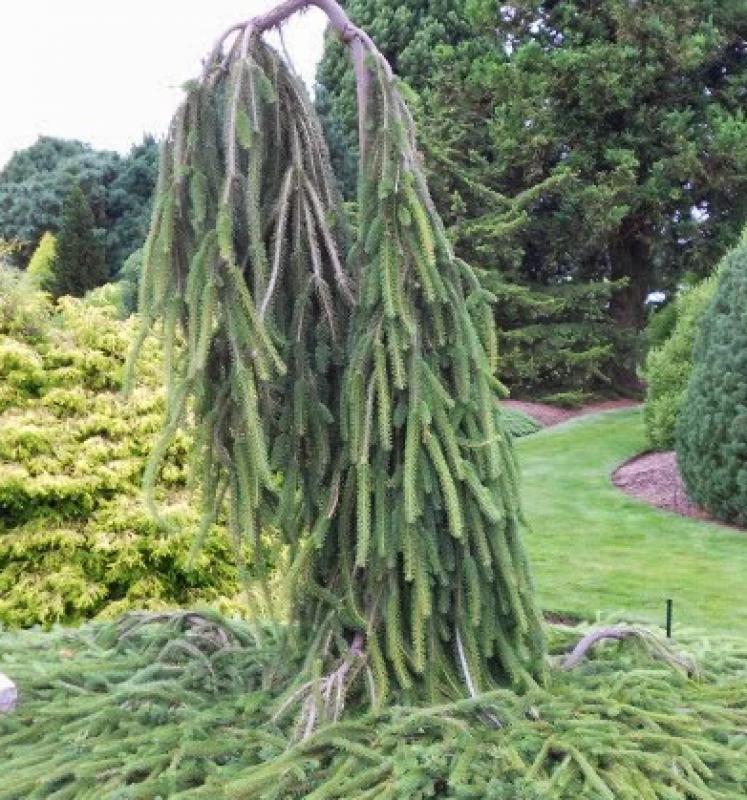 Rare. Uniquely weeping and creeping, with exceptionally long evergreen needles. As they mature, the plant fills out with loads of sweeping, weeping branches, flowing to the ground where they lay prostrate and layer themselves into a most excellent ground cover. Stunning specimen.