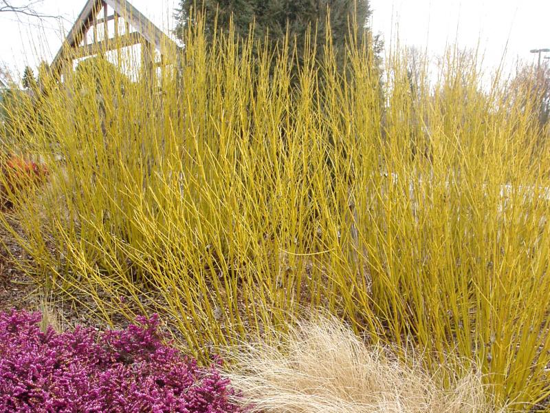 Dogwood - Yellow Twig Cornus sericea 'Flaviramea' Bright yellow stems on the younger growth of this multi-stemmed shrub provide striking winter color. Use bare stems in seasonal arrangements. Great in shrub borders or mass plantings. US Native. Ideal for naturalizing. Deciduous. 9’T x 9’W. Zones 2-7.