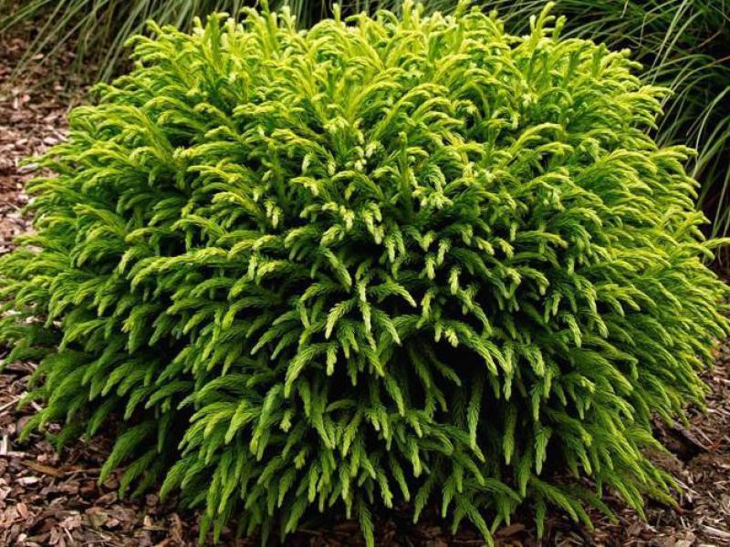 A superb selection that retains a natural, dense, dome shape with little care. The finely textured foliage that is soft to the touch breaks up the bold effects of large leaved plants. Foliage is yellowish-green in summer turning slightly bluish or rusty red in winter. Dwarf, globose, compact habit.