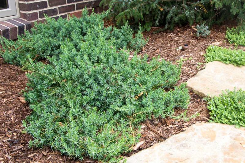 Blue Pacific Juniper Juniperus conferta ‘Blue Pacific’ Dense blue-green foliage looks best left in its natural form. Heat and salt tolerant variety, thrives in thin soils. Superb on slopes for coverage or erosion control, allow it to drape over retaining walls or cover unsightly transition zones at the edges of paving. Evergreen. Full sun. 1.5’T x 6’W. Zones 6-9.