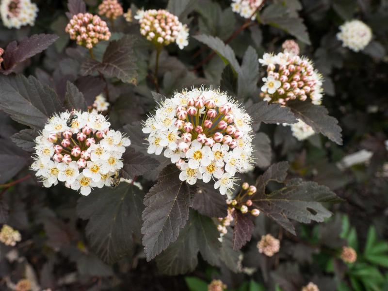 Intense reddish- purplish foliage on upright arching branches that form mounds. Creamy-white flowers with dramatic dark foliage in summer. Plant en masse to create a richly colored, dense hedge or screen. Deciduous.