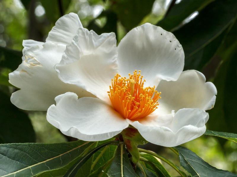 Rare. Gorgeous large shrub or small tree with fragrant white Camellia-like flowers late in summer. Orange-purple-red fall color. Incredible specimen. Deciduous. Native to Georgia; now extinct in the wild. Needs rich, acidic, moist soil with excellent drainage. Not drought tolerant. Can live 100+ years.