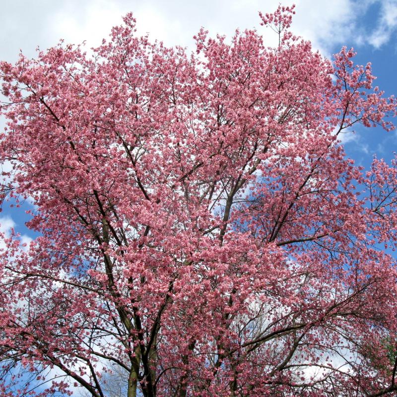 Delightful fluffy carmine-pink flowers bloom in clusters of two to five. Beautiful fall display when leaves turn yellow, orange, and red. A stunning specimen, incredible lining a driveway. One of the finest flowering cherries.
