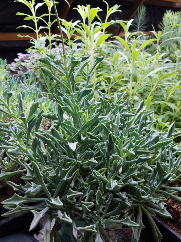 Spearhead Senecio kleiniiformis syn. x Senecurio kleiniiformis Charming succulents featuring powdery, blue-green foliage. The outreaching arms carry adorable, cupped and ‘finned’ leaves. Over time, it will form into large basal clumps. Allow to fully dry out before watering. Member of the Aster family. 8-12”T x 12-18”W. Zone 10b. Low maitenance.