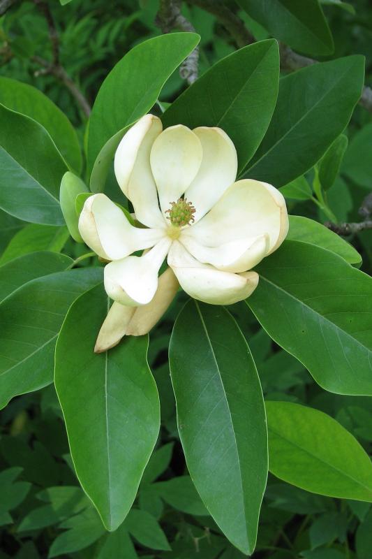 Magnolia - Sweetbay Magnolia virginiana Wonderful NC Native with creamy-white vanilla-lemon scented flowers in spring and summer. Bright scarlet-red seeded fruit ripens in late summer attract birds. Loose, open upright habit. A lovely, graceful small patio or specimen tree. Plant in a protected area. Pleasing green foliage. Semi-evergreen - may be evergreen during mild winters. 10-35’T x W. Zone 6.
