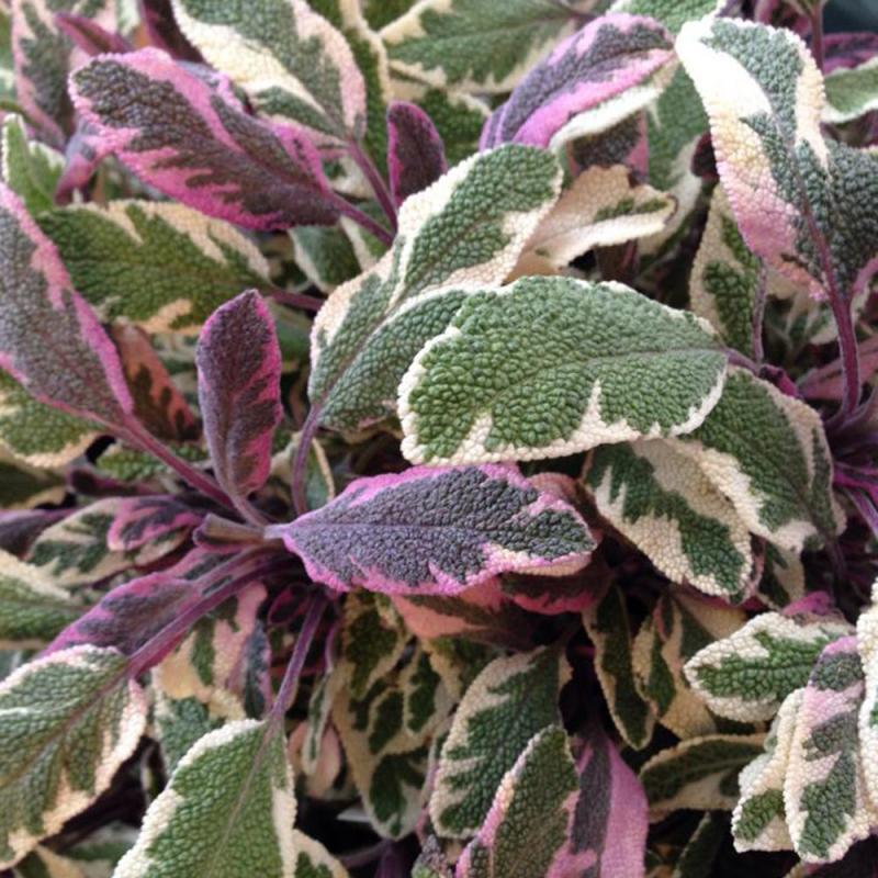 A colorful sage! Edible herb with grayish green leaves marbled with white, pink, and purple. Strongly aromatic foliage may be used fresh or dried in cooking. Attractive to bees and butterflies. Needs good drainage. Ideal for herb gardens, mixed borders, and containers. Perennial.