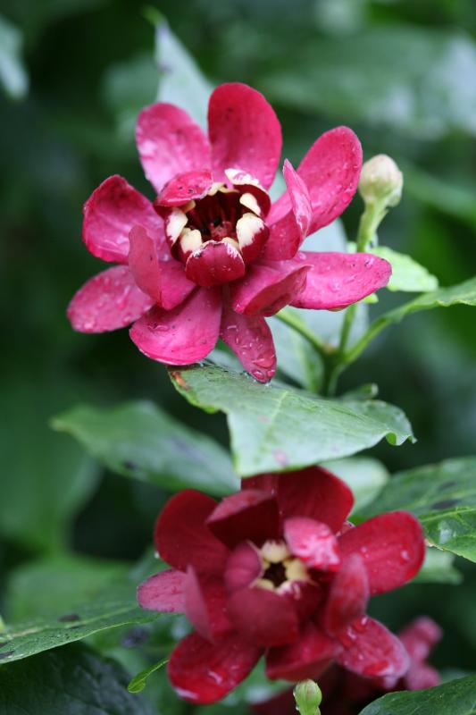 Fragrant, 3-6”, bright red magnolia-like flowers appear in spring and keep blooming through summer. Glossy green foliage. Leaves, seed pods, and bark have a spicy scent when crushed. Excellent cut flowers, great for dried potpourri. Deciduous.