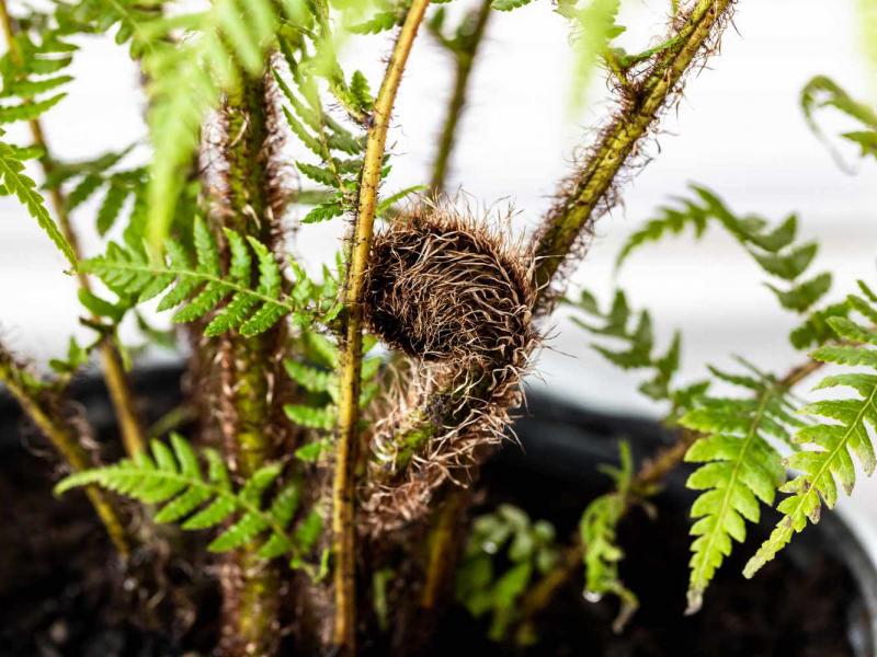 A prehistoric giant! These fabulous ferns can get HUGE. They have a single furry brown trunk, and the baby fronds are covered in brown and white hairs. They are native to Australia.