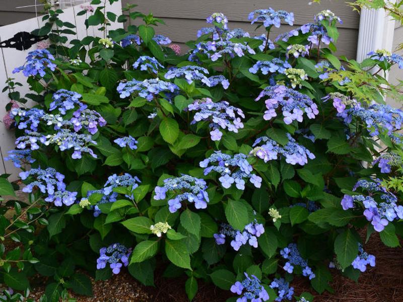 A lovely lacecap Hydrangea, with lacy centers surrounded by gorgeous blooms of pink or periwinkle blue, depending on soil pH. Sturdy bright red stems. Rebloomer, so you can enjoy way more blooms! Deciduous. Prefer well-drained, rich, moist soil.