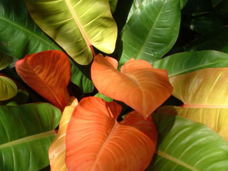 Flamboyant and handsome! New leaves are bright, glossy orange changing to copper, to yellow-green, and mature to deep green. These are incredibly stunning in person, providing many colors on one plant at the same time.