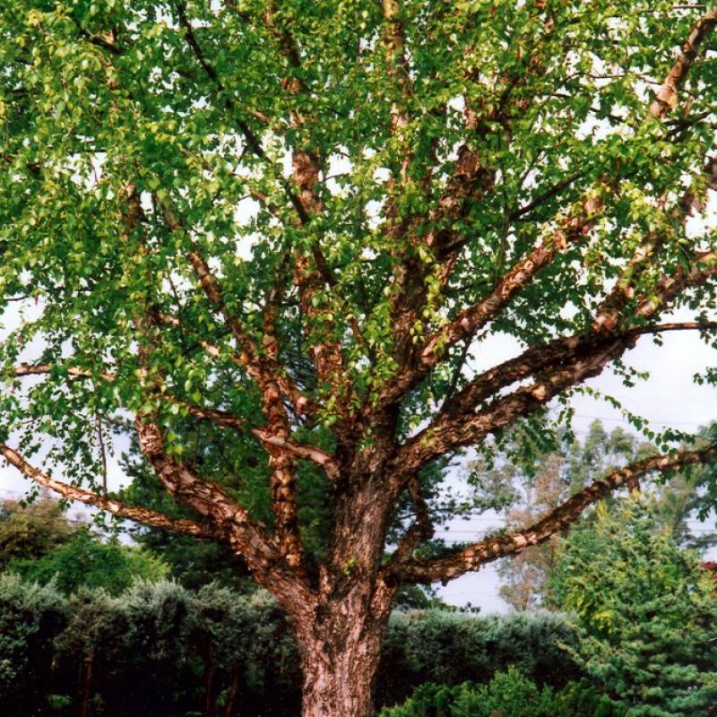 Adaptable & attractive! Young trunk features fantastically curly, paper-thin, pinkish-tan bark year round. Great fall color. Extremely resistant to the bronze birch borer. Excellent specimen, in rain gardens or other moist areas. Selection from NC native species. An important tree for birds.