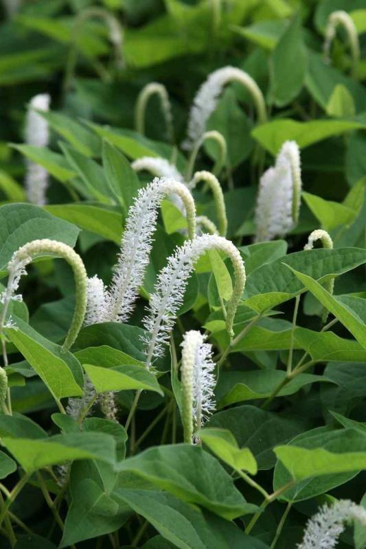 Charming dark green heart shaped foliage and arching slender spikes of white flowers in summer. Perennial. Native to WNC and most of the US East Coast. Long history of medicinal use, excellent for wetland restoration. Can grow in water up to 4” over crown.