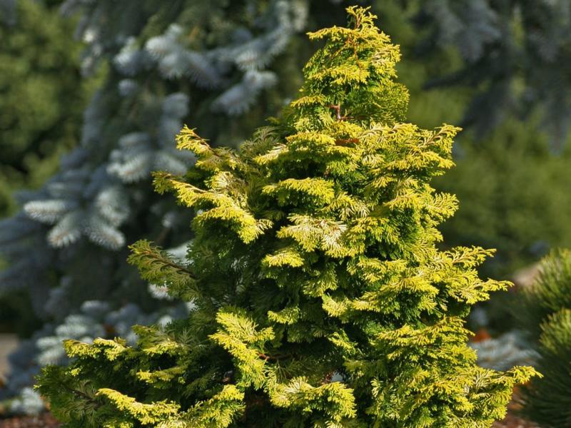 RARE. Full, upright and eventually pyramidal form with elegant, beautiful sprays of evergreen foliage. Bright yellow on the outermost foliage, surrounded by darker shades of yellow, gold, and dark green on the interior foliage. Choice smaller specimen, accent, or container plant.