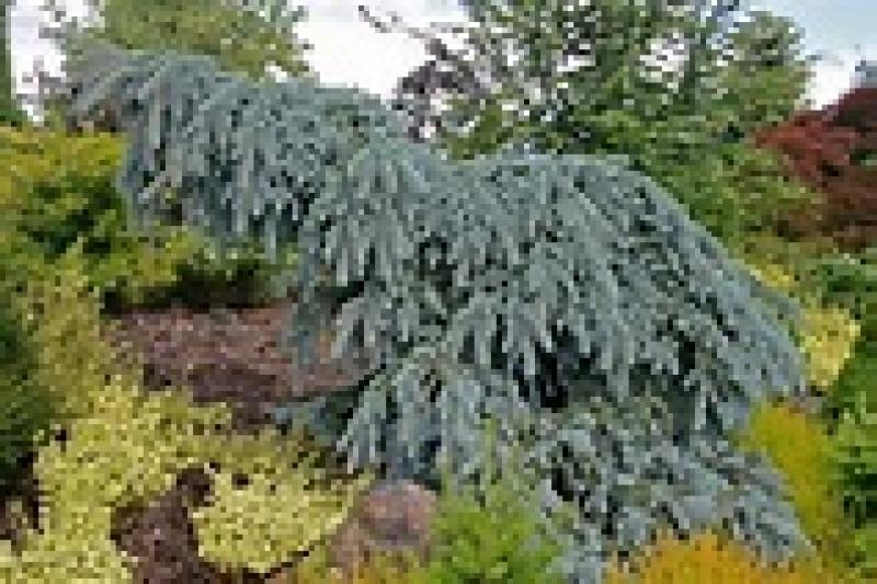 RARE. Superb specimen! Lush blue spring foliage drapes off of downward flowing branches creating a pleasing waterfall of year-round color. May be trained to flow along a fence, deck railing, or stone wall and then allowed to spill across the ground. Evergreen.