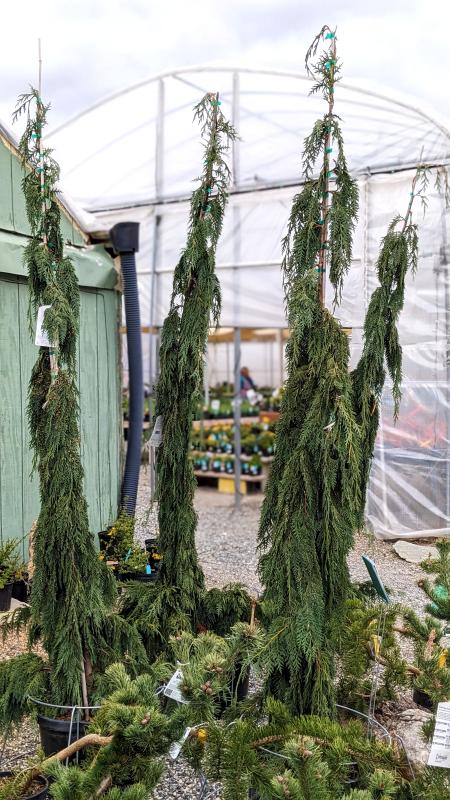 An elegant and unusual selection. Extremely narrow habit, with a strong central leader and varied branching - each will have a unique form. Evergreen. Shaggy red-brown bark. Phenomenal specimen or accent plant. Was found growing in the wild in Vancouver, Canada. RHS Award Winner. Can live 70+ years.
