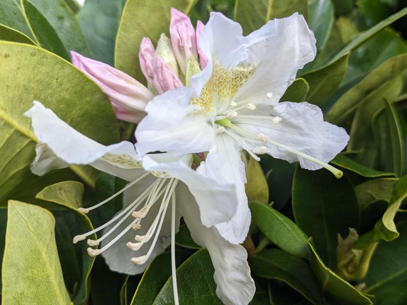 An elegant variety with pink buds that open to large white blooms with a copper blotch, that cover the branches mid spring. Dense, dark green evergreen foliage, with an upright, spreading growth habit. Great foundation plants. Pre-1900s UK cultivar.