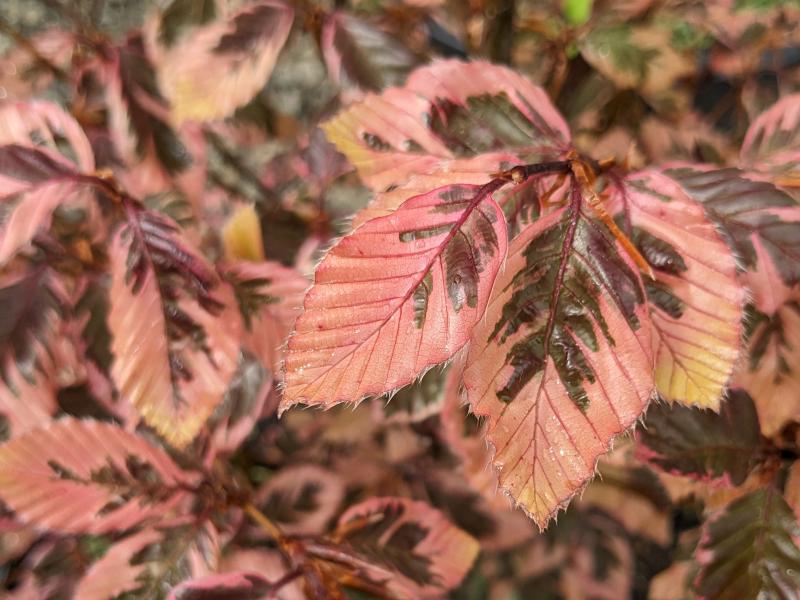 Striking foliage is purple with irregular pinkish- white and rose borders, with the purple turning to green in summer.    Incredible specimen tree with an overall pink effect. Slow growing; long lived. Deciduous. Prefer slightly acidic, moist, well-drained soil.