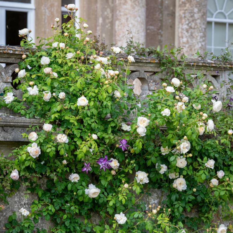 So dreamy! Pale lemon buds open to creamy white flowers, with an incredible 120 fragrant petals per bloom. Beautiful growing around a doorway, on an arch, fence, or wall. From 2007.
