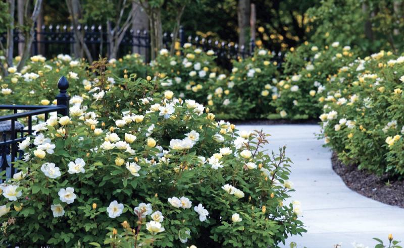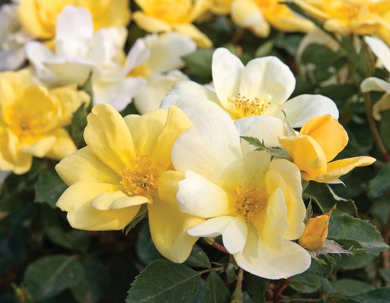 Rose - Sunny Knockout® Lovely yellow to cream flowers, abundant and continuous until frost. 8-11 petals per bloom. Color is more intense in cooler weather. Bushy habit. Foliage is dark green, semi-glossy. Repeat bloomer. Disease resistant. 3-4’T x 3-5’ W. Zones 4-10.