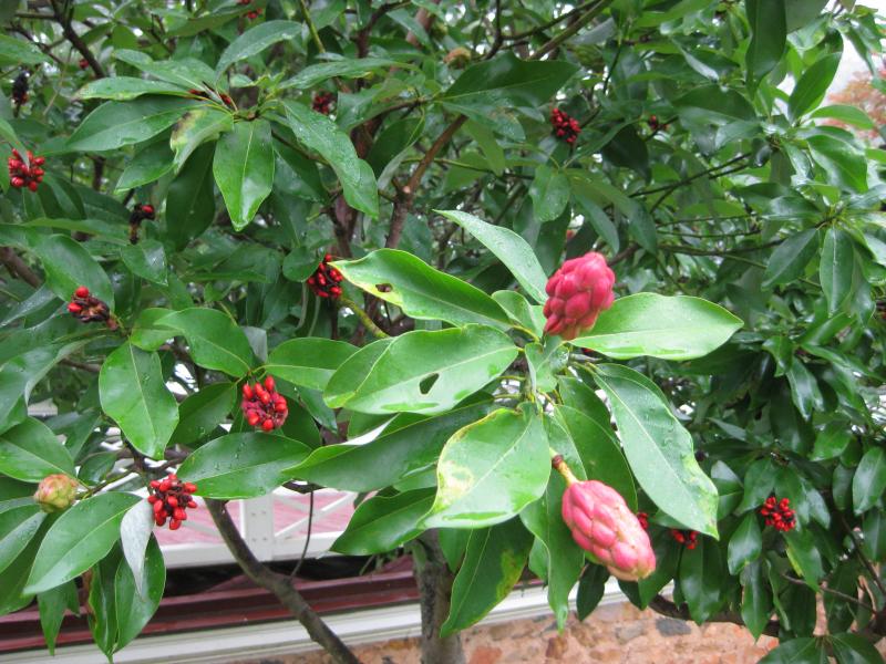 Magnolia - Sweetbay Magnolia virginiana Wonderful NC Native with creamy-white vanilla-lemon scented flowers in spring and summer. Bright scarlet-red seeded fruit ripens in late summer attract birds. Loose, open upright habit. A lovely, graceful small patio or specimen tree. Plant in a protected area. Pleasing green foliage. Semi-evergreen - may be evergreen during mild winters. 10-35’T x W. Zone 6.