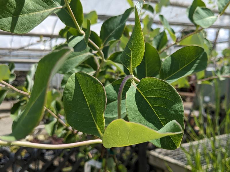 Native to North America (Colorado), these unusual, dusky-green leaved vines resemble eucalyptus - especially when in bloom. As the season progresses, flower buds pop out like saucers. These rounded bracts look a lot like eucalyptus, but the fragrant flowers at the center feed native pollinators like hummingbirds! They turn into red berries in the fall.