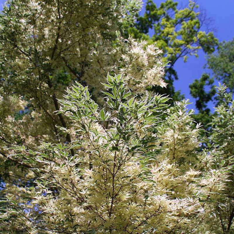 Vase-shaped tree has small, dainty, variegated green and white leaves sometimes tinged with pink. In fall, the creamy margins turn a blazing magenta. Consider this elegant, unusual tree for a dramatic entry planting, or specimen in light shade.