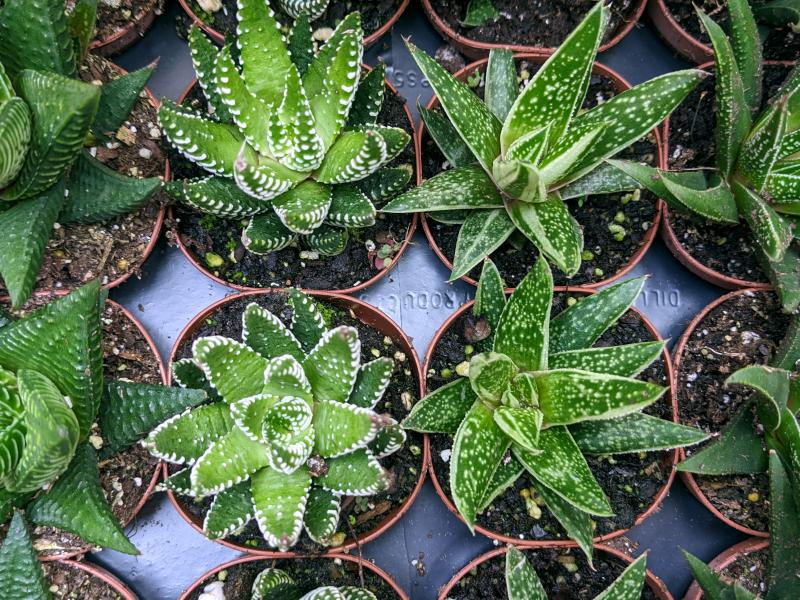Charming, small succulents that form rosettes, with foliage ranging from spiky to “window panes”. Related to Aloes; native to Southern Africa. In the wild, these like to grow under rocks and other shrubs for protection from the sun.