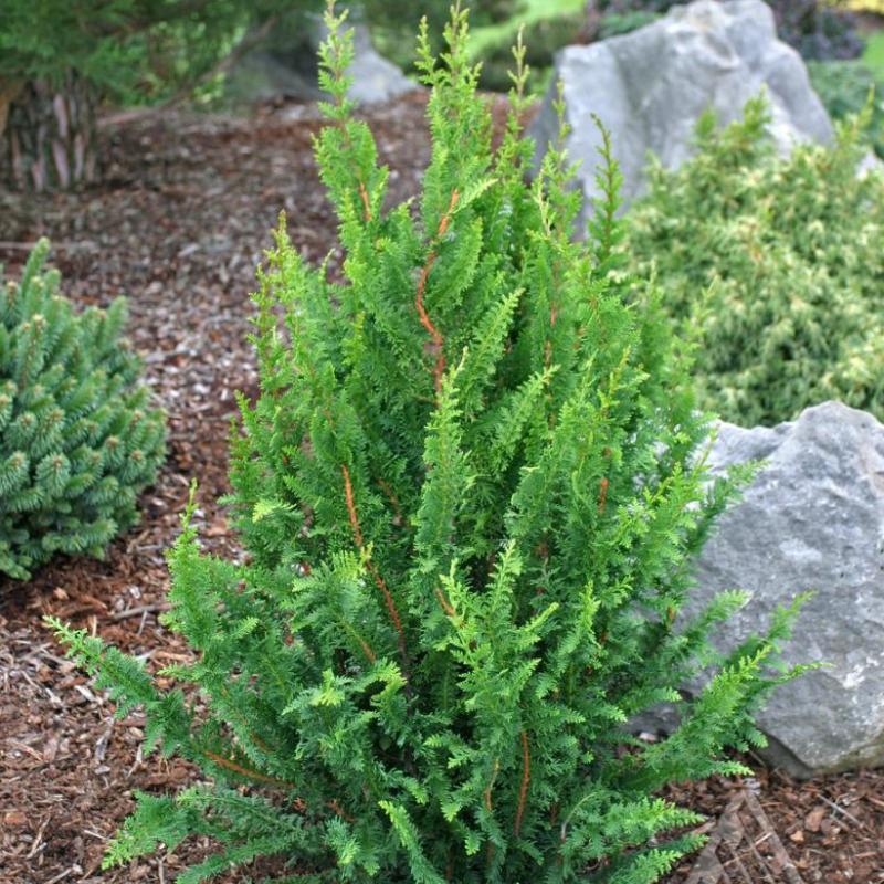 Delicate, fern-like foliage. Each arching, rich green branch tapers to a fine point, instead of the more usual cupped tip. Will develop a handsome, open habit. Good specimen or in an evergreen hedge. Grow in moist, well- drained soil.