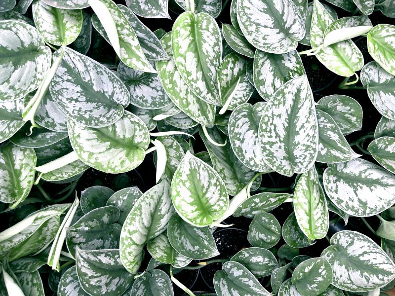 Lovely leaves! Large-leafed cultivar of Scindapsus pictus with more intense variegation than the species. Native to Southeast Asia, epiphytes that grow up trees - can climb moss poles or trail down.