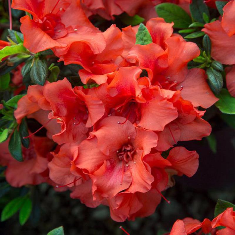 Blazing fiery-red semi-double 2.5” blooms. Repeat bloomer. Handsome evergreen foliage. Awesome massed, in low hedges, foundations, and in containers. Prefers morning sun, afternoon shade, and moist, well-draining soil.
