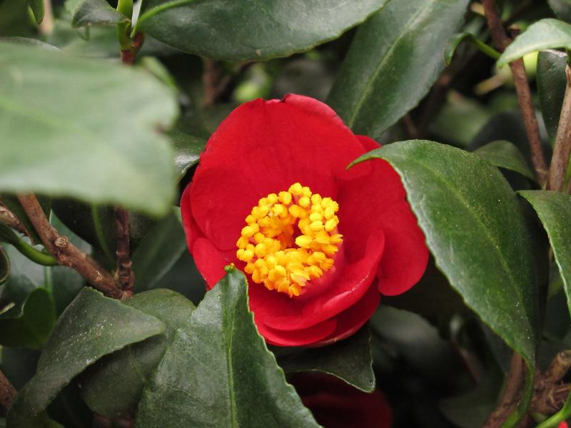 Fragrant, gorgeous single red flowers (3-5”) with showy yellow stamens bloom in early spring. Seed was originally collected in Korea. One of the most cold hardy Camellias, reportedly surviving a cold snap of -23F. Compact, with beautiful evergreen foliage. Prefers morning sun and afternoon shade. Protect from winter winds.