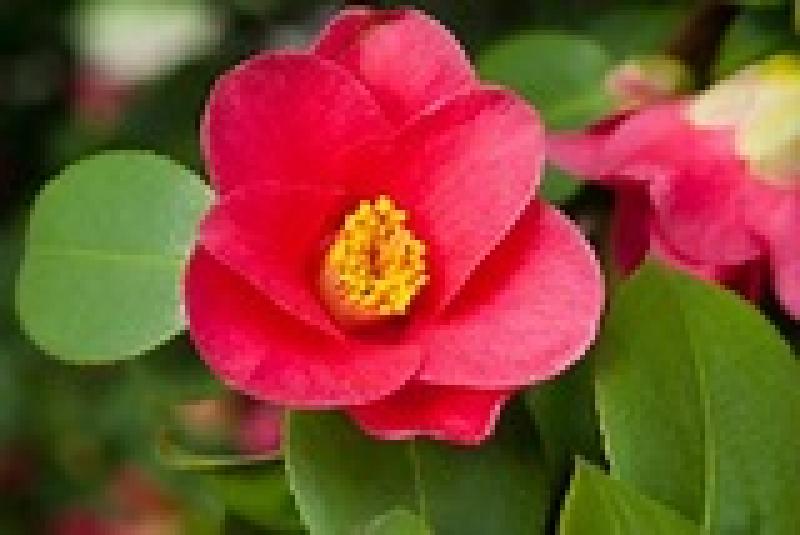 The beautiful rose-red, single flowers can potentially bloom intermittently, during warmer weather, from fall to spring. Upright and compact form. Glossy evergreen foliage. Bred in NC. Prefers morning sun and afternoon shade. Protect from winter winds.