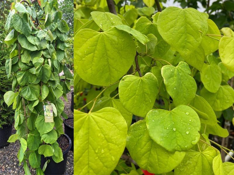 Simply spectacular! Lavender-pink spring blooms are followed by new heart-shaped leaves tinged with orange, becoming bright golden-lime green. Fall foliage color is yellow.
