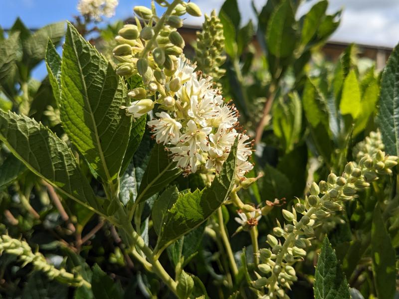 Very floriferous, dwarf form of an attractive NC native shrub. Fragrant long-lasting late summer flowers. Shiny dark green foliage. Lovely in a bed or border, a woodland or shade garden, or a waterside planting. Prefers acidic, medium to wet soil.