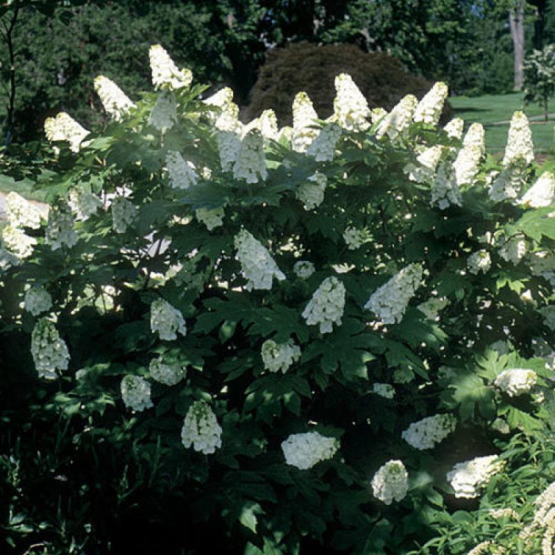 Gorgeous! Produces large double white lacecap flower clusters from spring through summer. Dark green oakleaf shaped foliage turns crimson in fall. Graceful arching habit. Wonderful massed. Oakleaf Hydrangea is a NC Native species.