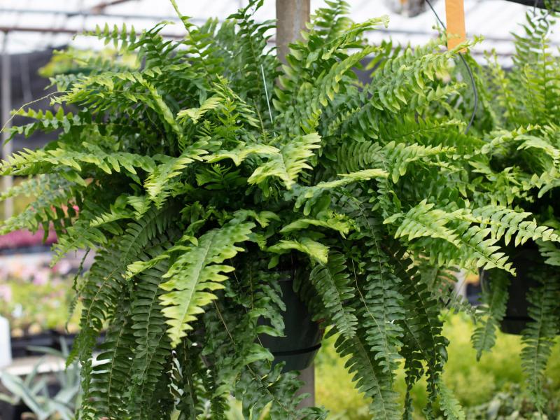 Boston Fern Nephrolepis exaltata Lush, luxuriant, and soft! Nothing says summer like hanging baskets of happy and fluffy Boston ferns on shady, covered porches. These tropical ferns prefer moist, well-draining soils kept consistently moist but not saturated, though drier in winter. High humidity, bright to medium indirect light. Keep above 45°F. 2-3’T x 2-3’W.