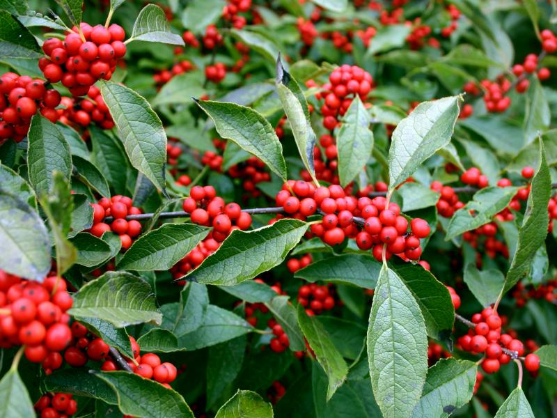 Bright red berries appear from late summer to early fall. New foliage growth emerges showy red. Oval to rounded, shrub with rich, deep green deciduous foliage. Grows best in moist, rich, acidic, well-drained soil, yet tolerant of wet soils as well. Needs a male, such as Apollo or Red Chief, for good fruiting.