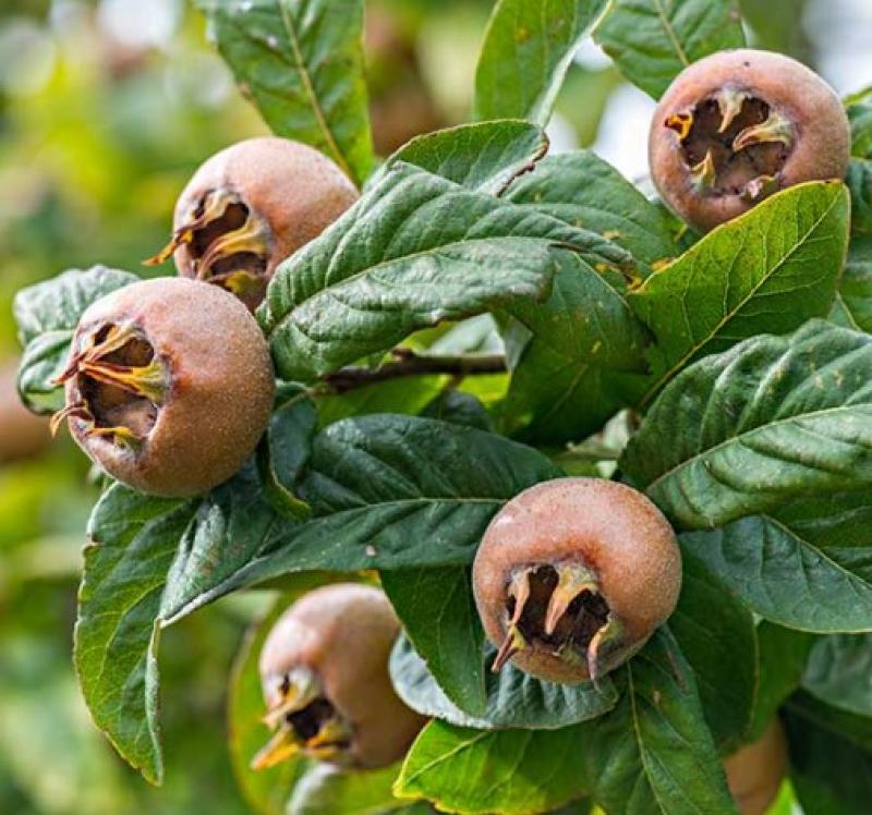 Rare. Attractive, compact, and productive. Prized for its abundant crops of large, dark brown, flavorful fruit. Tasty sweet-tart flavor with a creamy texture, best for fresh eating or jelly once bletted. Large, dark green foliage with white flowers. Once widely grown in Europe. Low maintenance. Self-pollinating.
