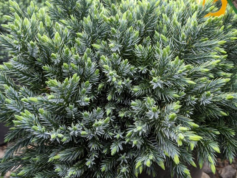 Blue Star Juniper Juniperus squamata ‘Blue Star’ Attractive sparkling ice blue foliage on dense, spreading branches, in graceful wide mounds. Creates a colorful contrast to purple and green foliage plants. Use in rock gardens, or as a low border plant. Ideal for mass plantings. Drought tolerant and extremely resilient once established. Evergreen. Full sun. 3’T x 4’W. Zones 4-9.