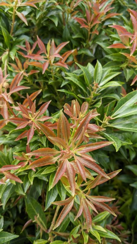 Dramatic clusters of tiny white flowers cascade over these beautiful broadleaf evergreen shrubs in spring. New growth is brilliant scarlet, turning dark green when mature.