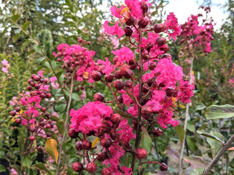 Dwarf crape myrtle with showy red buds opening to pink blooms. Perfect for smaller spaces and containers. Deciduous. Native to East Asia.