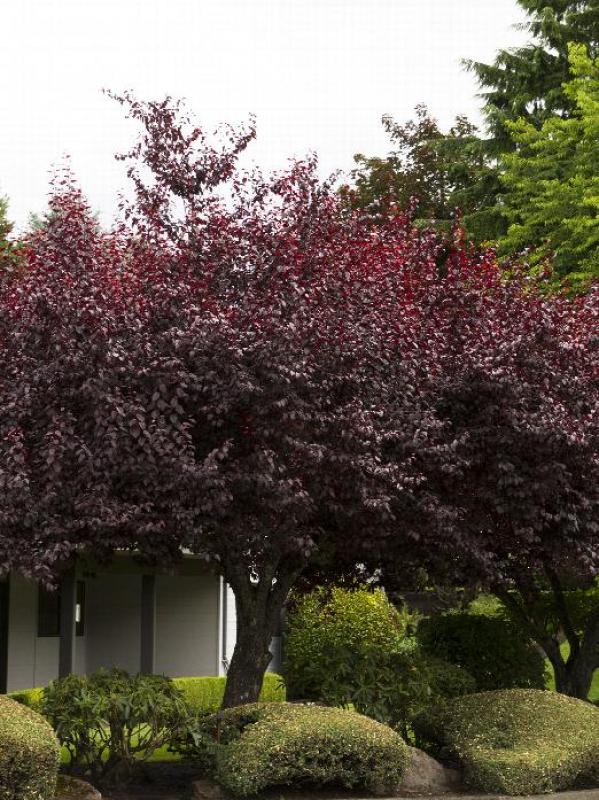 Beautiful showy, fragrant, light pink flowers in spring. Dramatic dark purple-black summer foliage. A phenomenal ornamental specimen for landscapes that seldom produces fruit. Deciduous. Species is native to Western Asia.