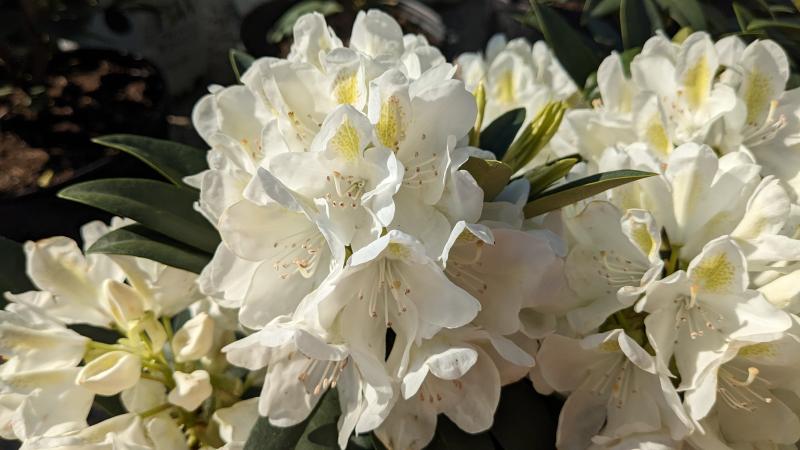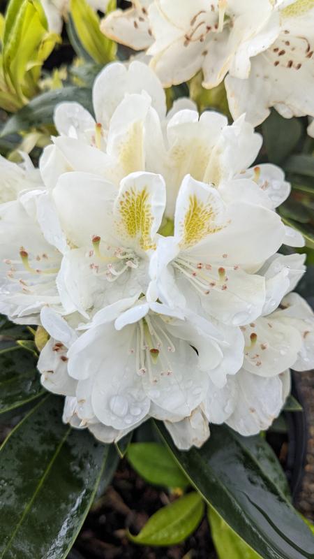 A classic favorite in the garden! Large, rounded trusses, each holding clear white bell-shaped flowers with yellow dorsal blotches. Dark green foliage; compact, dense form. Outstanding as a hedge or foundation plant. Evergreen. Needs acidic and moist, well-draining soil.