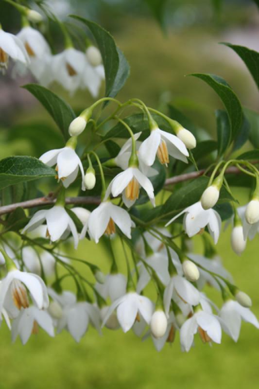 RARE. Enchanting! Pure white, bell-shaped flowers. Dark green, fine textured foliage and dense, symmetrical structure create a tree of great uniformity. Yellowish fall color. A splendid small tree for use adjacent to a patio or near a pathway. Resistant to twig dieback. Deciduous.