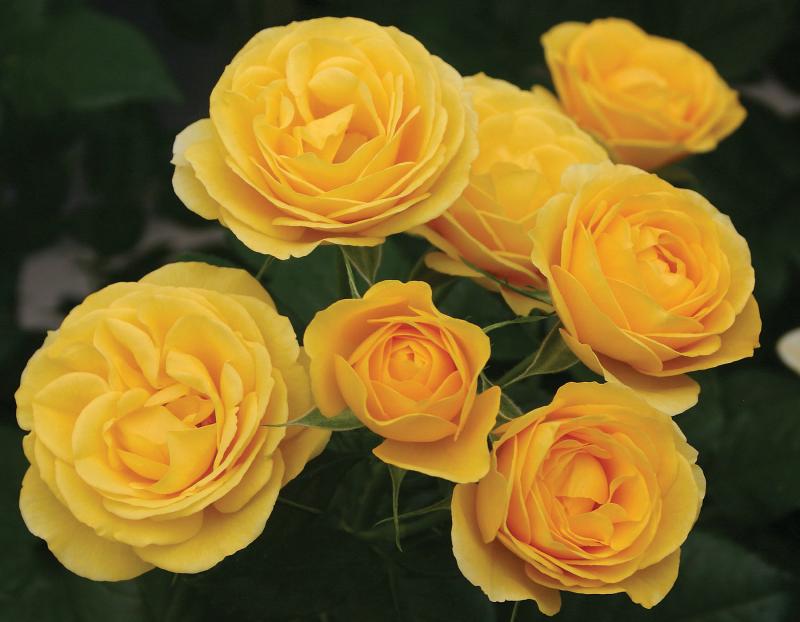 Bright yellow flowers combined with shiny, dark green foliage, with 25-30 petals per bloom. Bushy, compact form. These beautiful roses make a great feature in a patio container. They are also well suited for planting in a small garden. From Kordes, 2003.