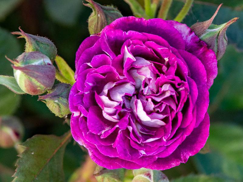 Out of this world color! Rich purple-pink flowers offering up a cloud-white reverse, up to 3” across. A large shrub in cooler climates, a climber in zone 8 and above. Scent: strong fruity. Disease resistant to powdery mildew, downy mildew, and rust. 6-7’T. Zones 4-9.
