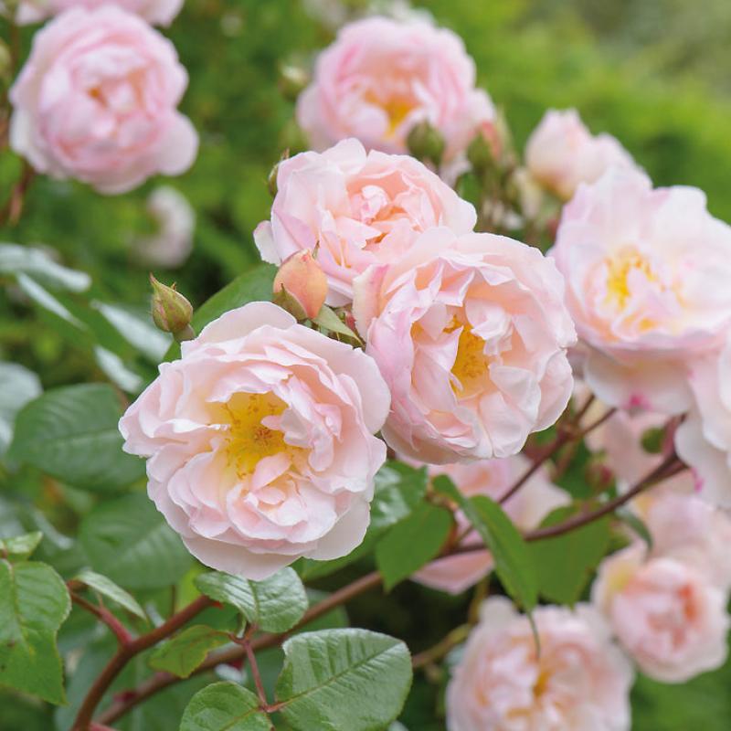 Pretty, semi-double flowers, each about 2” across, are held in sprays on long, slender and flexible stems. They are a pale pink color and of open formation, each exposing golden stamens. Foliage is a green-bronze color.