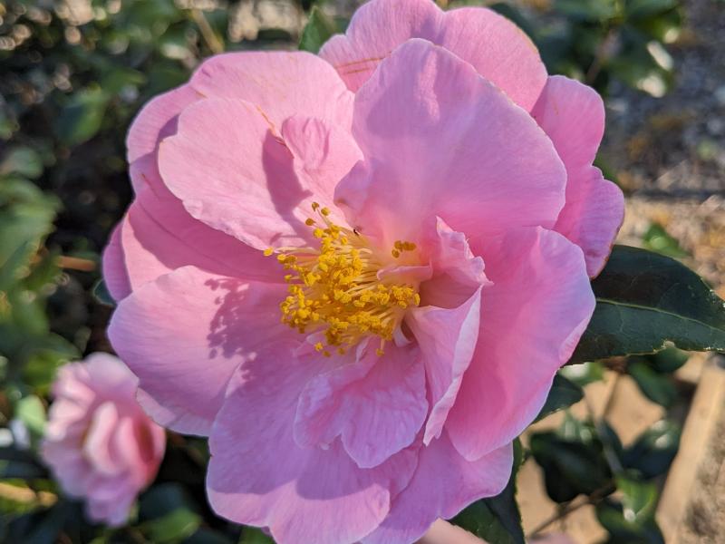 Lavish and abundant pink to coral pink 3-4” blooms in peony to semi-peony form. Dark green evergreen foliage on an upright, vigorous form. Prefers morning sun and afternoon shade. Protect from winter winds.