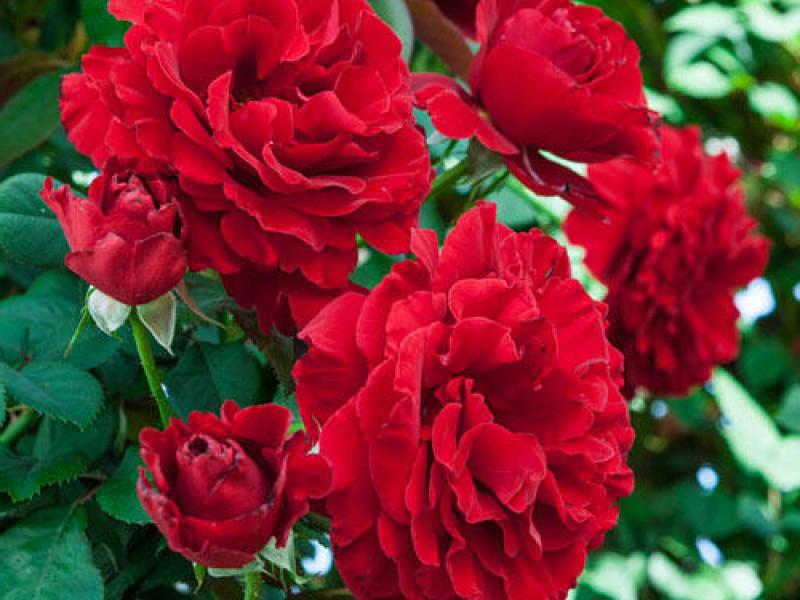 Classic ruby red suffused with occasional black smoke, these 3.5-4.5” double blooms, filled with 26-40 petals each, are simply stunning. Tight clusters of vivid blooms are offset by the dark green leathery foliage.